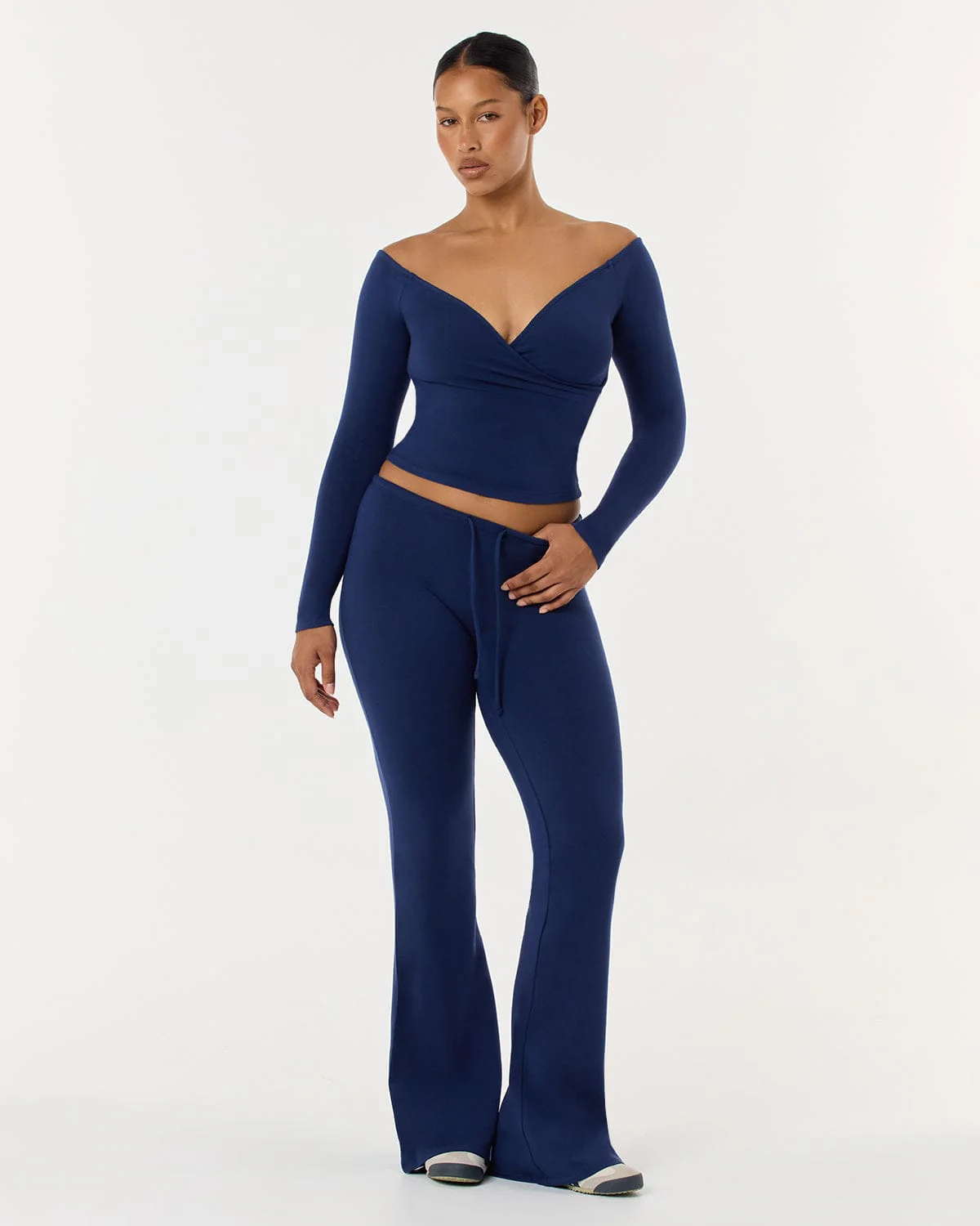 The most flattering long sleeve you will own with an off shoulder wrap silhouette. Pair back with the Drawstring Flare Pants for the ultimate lounge set or layer over your active in the cooler months.